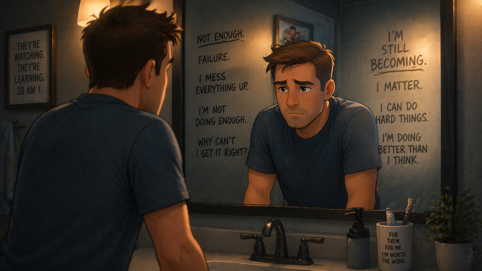 And here's the part a lot of parents miss. Your kids are listening to how you talk about you. They hear you call yourself stupid when you forget something. They hear you say you're a mess. They hear you tear yourself down over a mistake. And they're learning something in those moments. They're learning how an adult, the adult they love most, speaks to themselves. They're building their own inner voice on top of the one they hear from you.